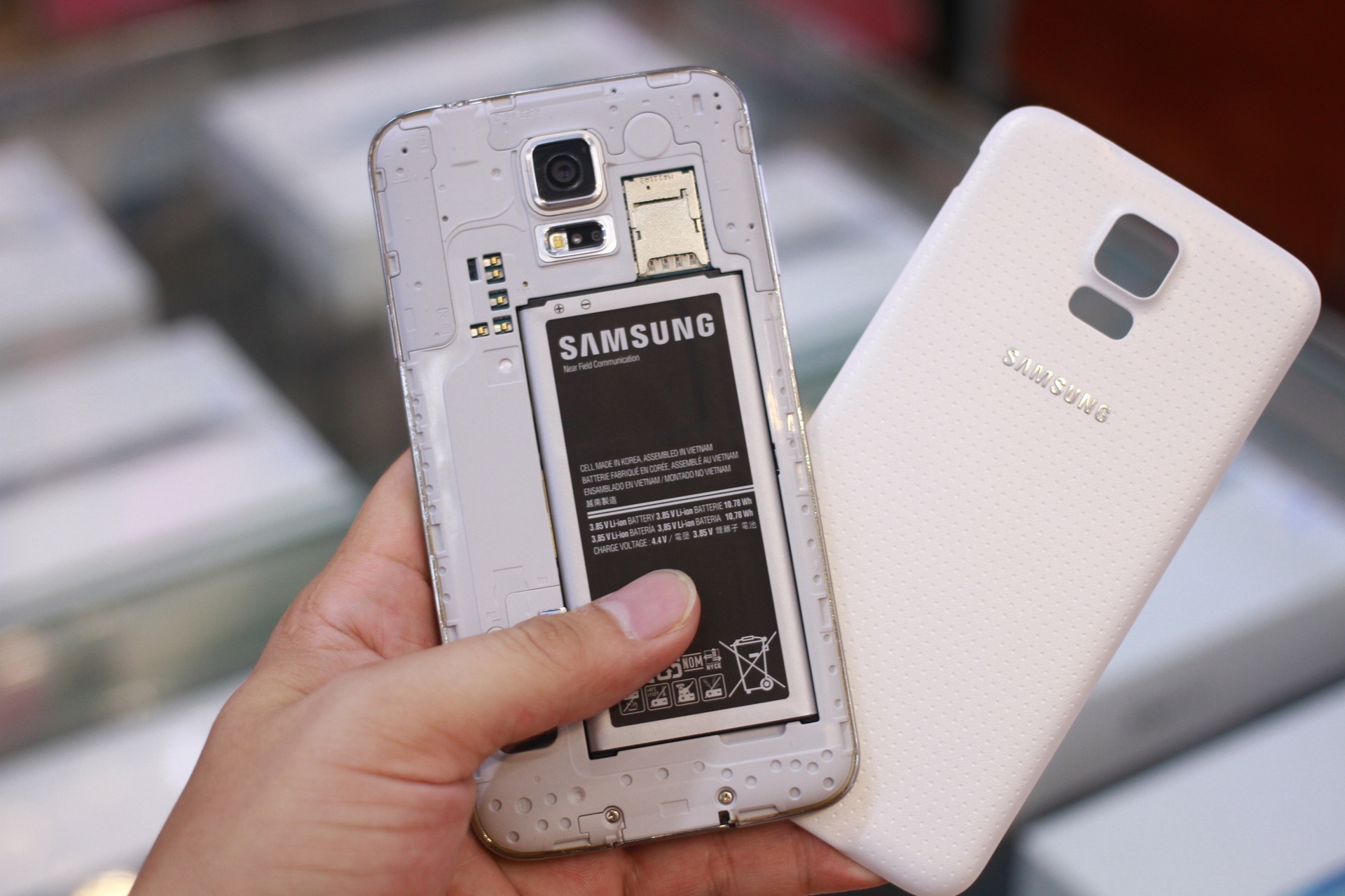 | Tuy có khả năng chống nước nhưng Galaxy S5 không thiết kế nguyên khối, vẫn sử dụng pin rời 2.800 mAh. |