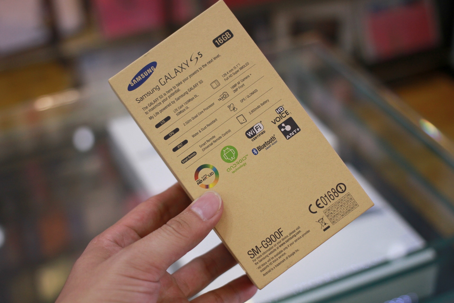 | Số hiệu trên hộp là SM - G900F, phiên bản dành riêng cho thị trường châu Âu. Điều này đồng nghĩa với việc phiên bản này có hỗ trợ mạng 4G và dùng vi xử lý Qualcomm, khác với phiên bản dùng chip Exynos 8 nhân cho thị trường Việt Nam. |