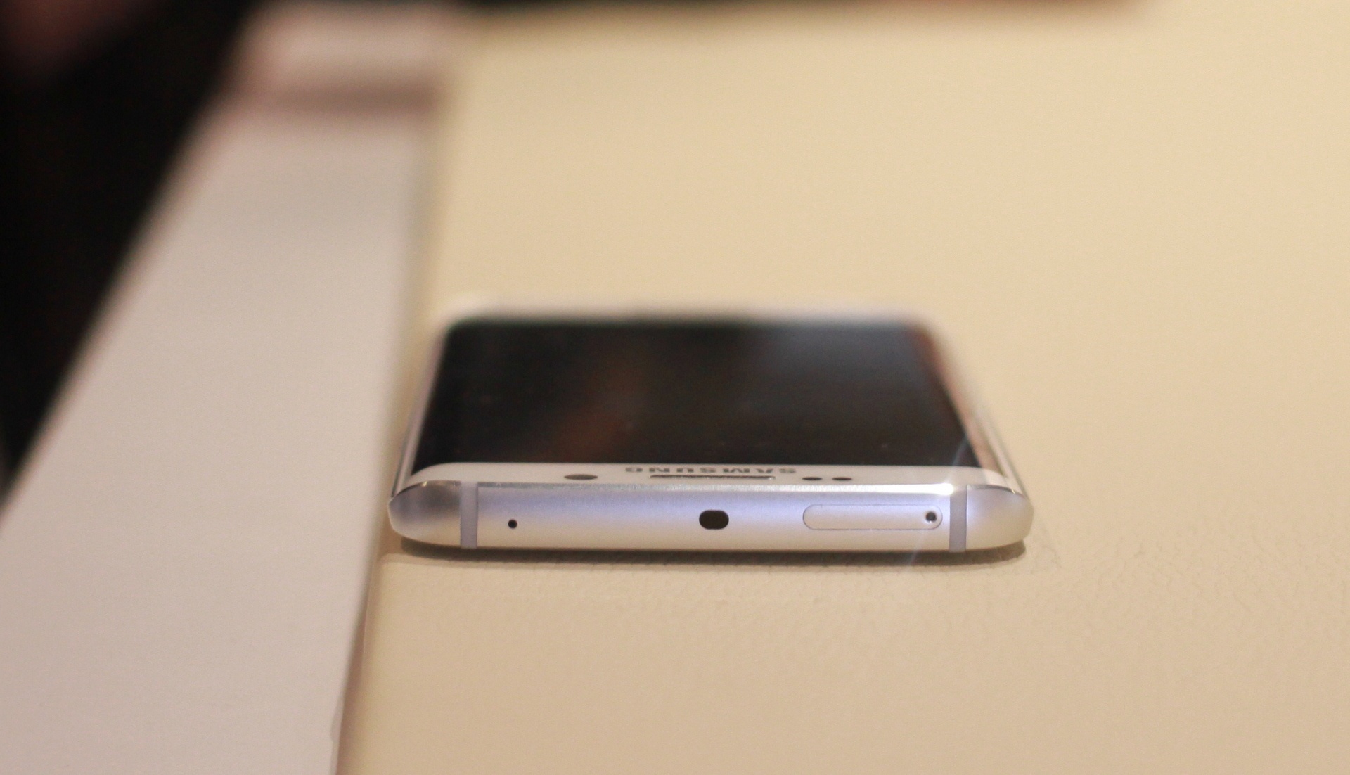 Khác với Galaxy S6, Samsung đưa khay cắm SIM lên đỉnh, do bên phải khá mảnh. Cạnh đó là cổng hồng ngoại, mic.