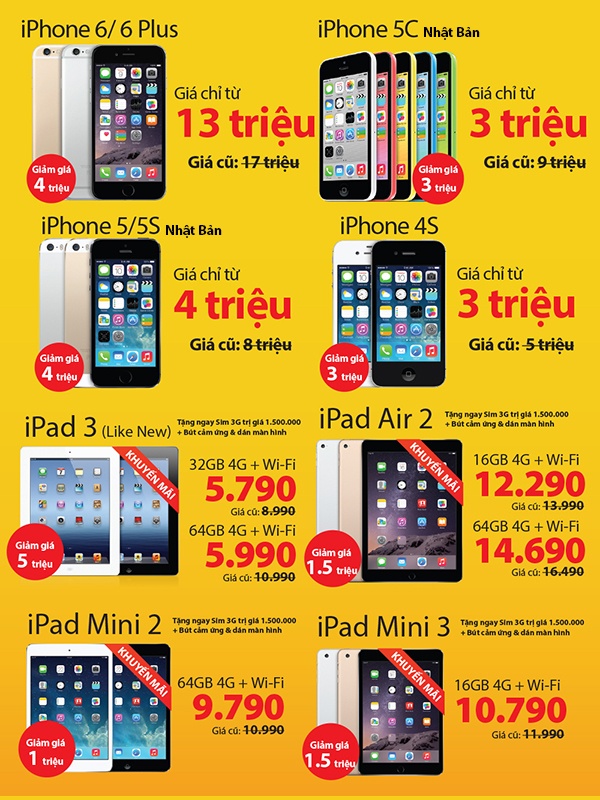 - iPhone 5/5C/5S: Giá chỉ từ 4 triệu đồng (Giá cũ từ 6,5 triệu đồng)