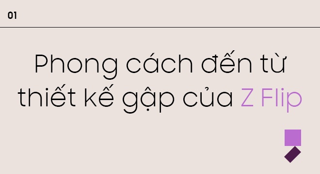 Kích cỡ và góc độ mới cũng đem đến cho Galaxy Z Flip nhiều phong cách khác nhau, bắt mắt và thời thượng. Đội ngũ thiết kế đặt kỳ vọng rằng mẫu điện thoại này sẽ trở thành một biểu tượng thời trang, thay đổi phong cách của người dùng. Với thiết kế độc đáo cùng 3 phiên bản màu sắc là tím, đen và vàng kinh điển, cao cấp nhưng vẫn rất đỗi trẻ trung, Galaxy Z Flip hoàn toàn có thể trở thành một món đồ thời trang giúp hoàn thiện phong cách của người dùng.
