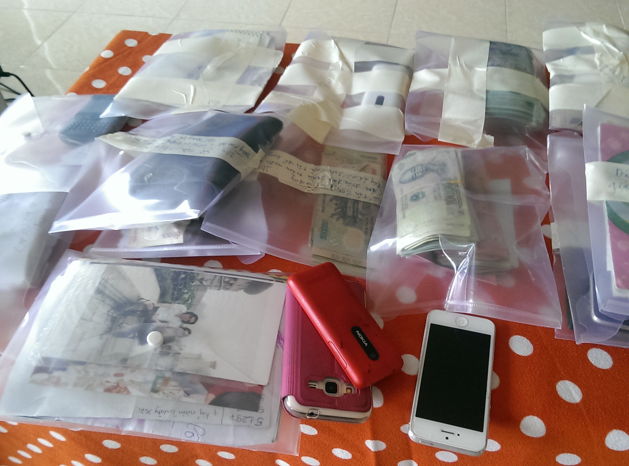 Tang vật công an thu giữ hơn 450 triệu đồng, 2.000 giấy biên nhận (tịch đề) thể hiện số tiền hơn 2 tỷ đồng, 12 máy fax, 6 xe máy, 16 điện thoại di động và 7 máy tính cùng nhiều sổ sách...