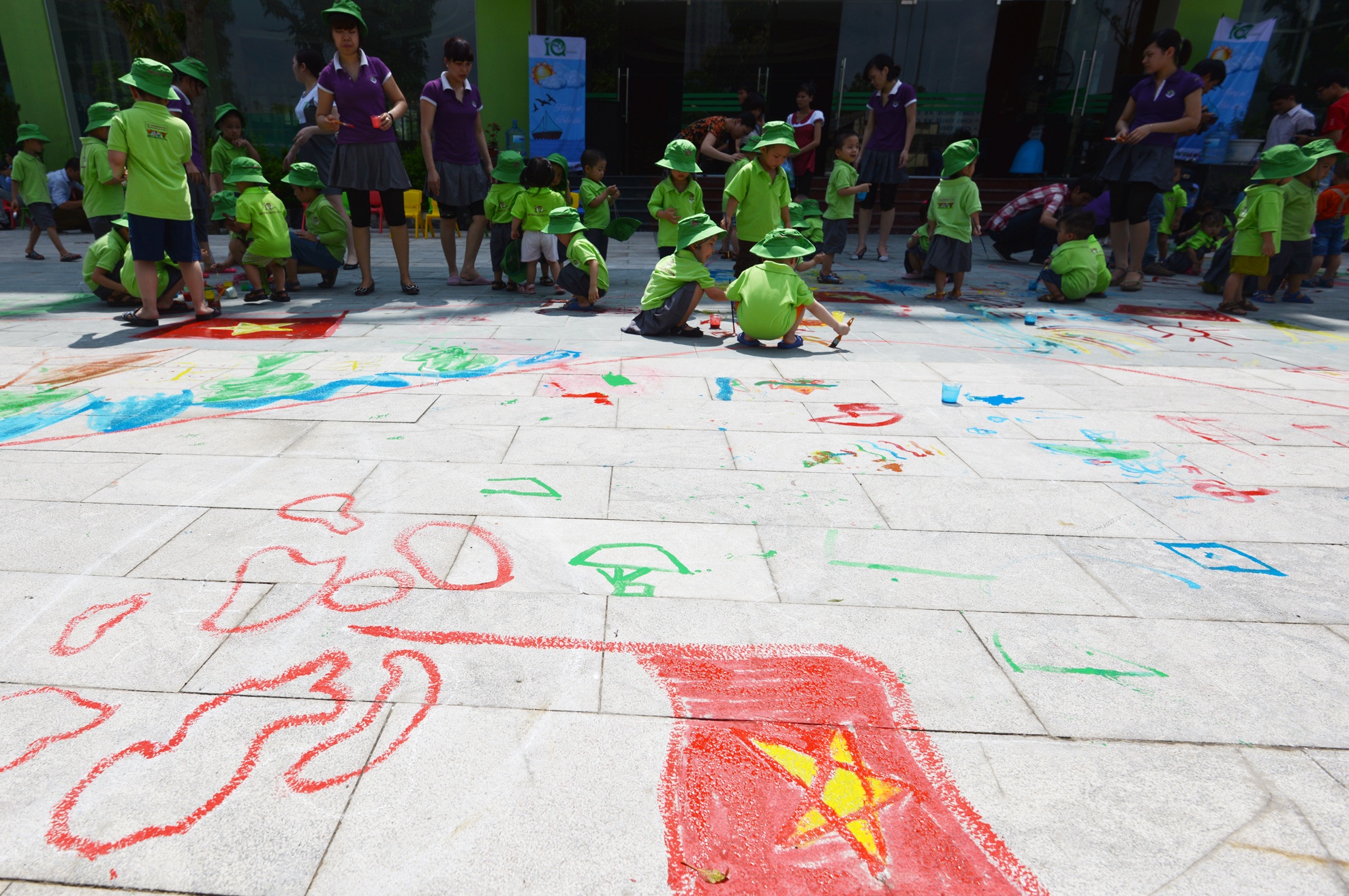 | Gần 100 bé cùng nhau vẽ lá cờ Tổ Quốc và hô vang khẩu hiệu Hoàng Sa, Trường Sa là của Việt Nam. |