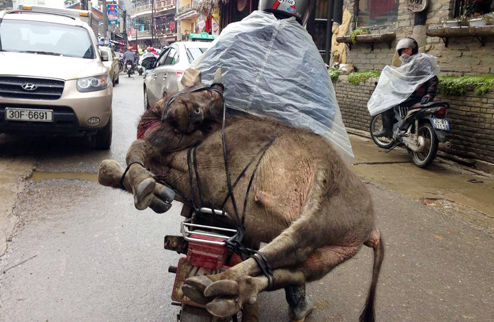 | Nhiều người dân chở trâu chết từ bản lên thị trấn Sa Pa bán. Ảnh: Quân Nguyễn. |