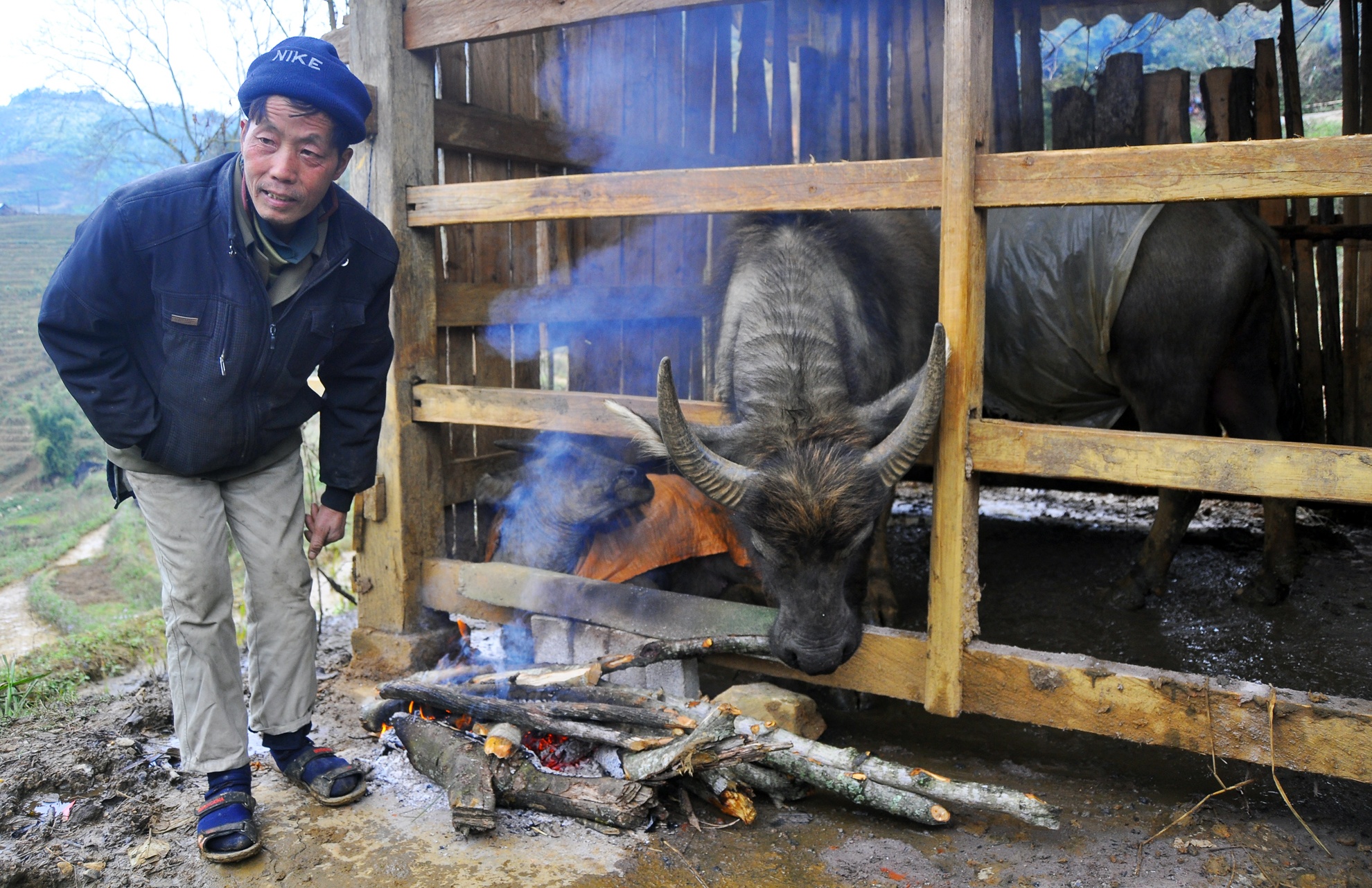 Ông Lý A Lử (xã Lao Chải, Sa Pa) cho biết phải thức cả đêm đốt lửa sưởi cho đàn trâu. Ảnh: Quân Nguyễn. |