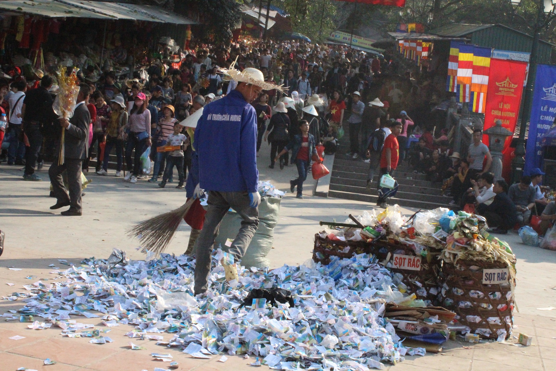 | Cuống vé thắng cảnh được gom cuối ngày cho thấy số lượng khách đến lễ chùa Hương khá đông. |
