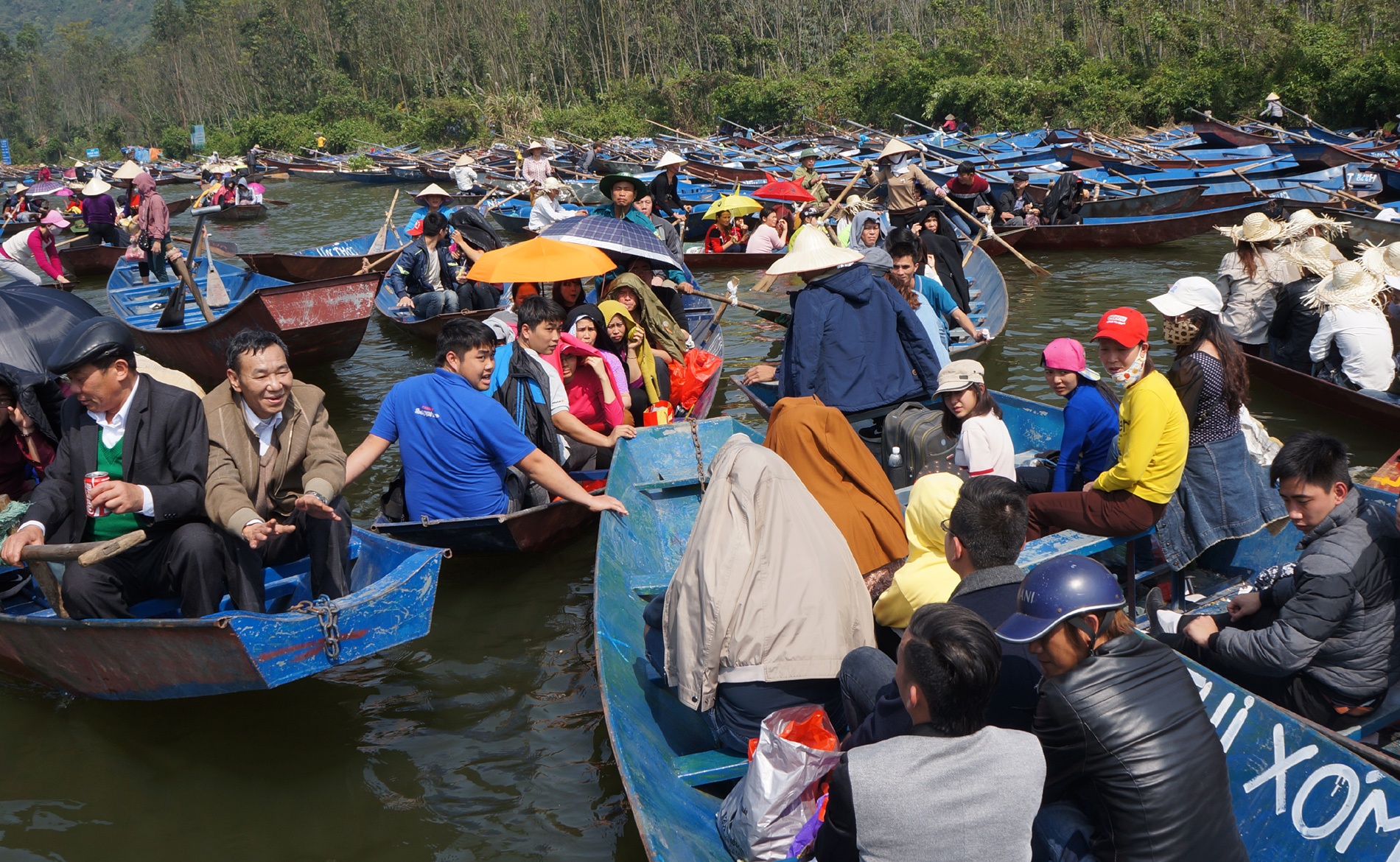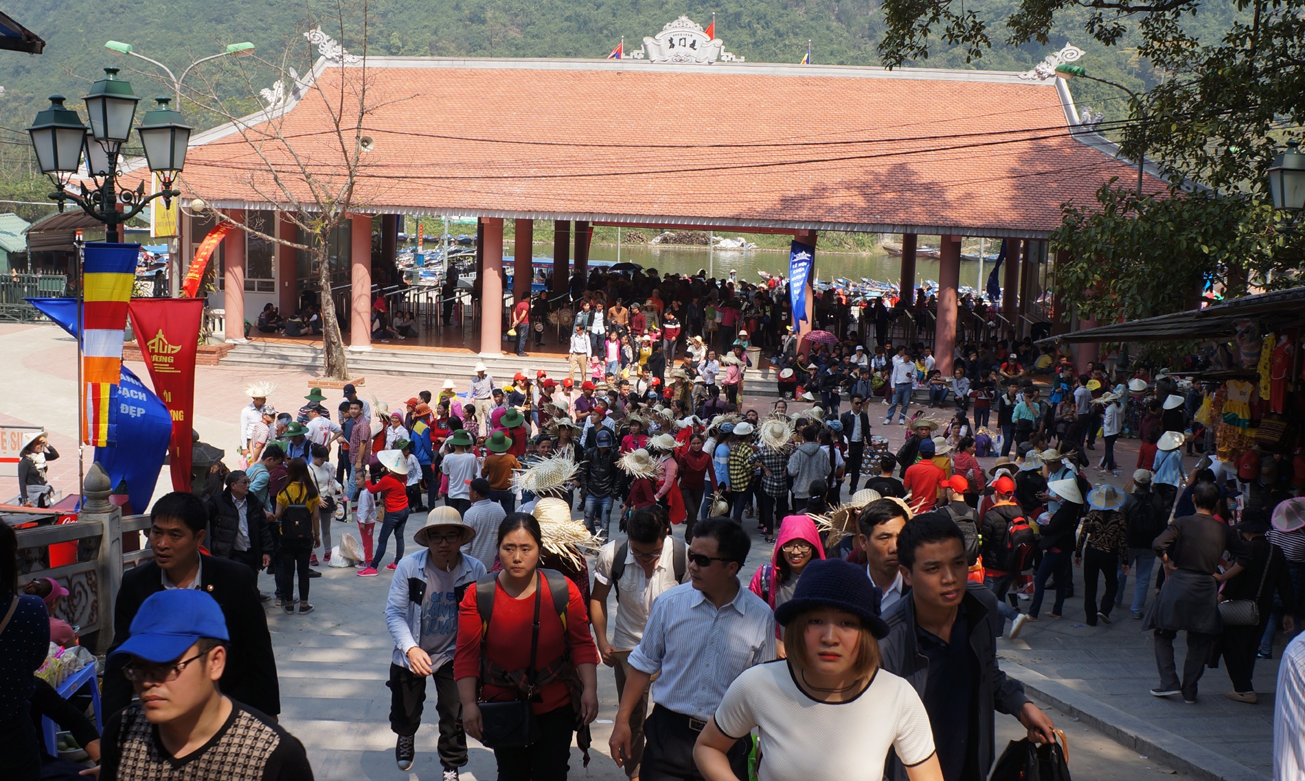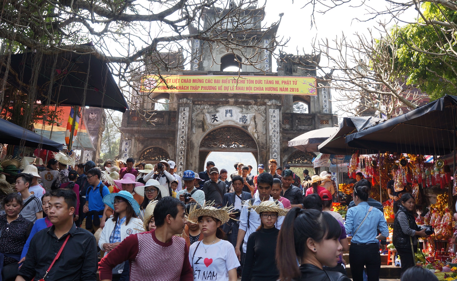 Ngã 3 lên chùa Thiên Trù và động Hương Tích có cả trăm người tập trung. Đây là điểm có nhiều nhà hàng, quán ăn... phục vụ du khách đi hành hương.