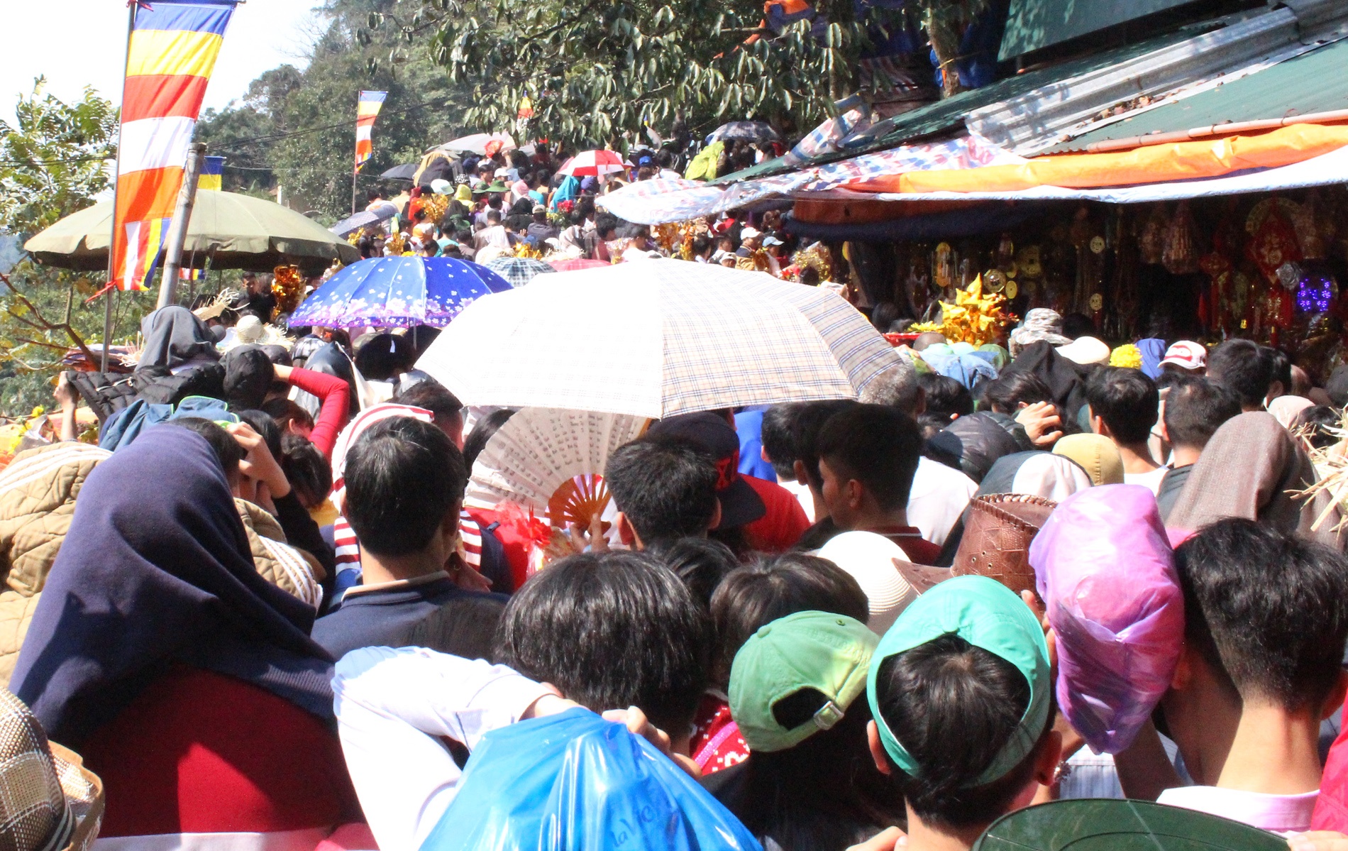 | Khách đông, nhiều đoàn hành hương ngồi nghỉ ở lối đi lại khiến giao thông bộ trong khu vực chùa ùn tắc. "Nhắc nhở bà con rất khó khăn vì họ nói mệt thì phải nghỉ" - sĩ quan ứng trực gần động Hương Tích chia sẻ. |