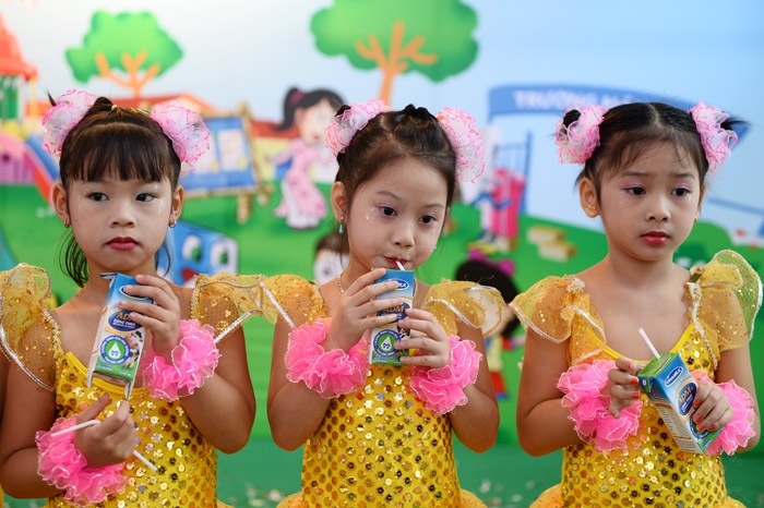 | Tại lễ phát động sáng 26/9, ngay cả các em diễn viên múa hát trên sân khấu cũng được phát sữa uống tại chỗ. |