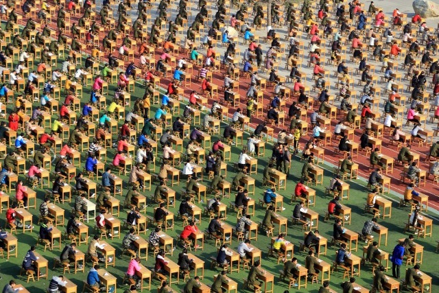 Các hộc bàn được quay lên phía trước nhằm ngăn các thí sinh cất giấu tài liệu. Ngoài các cán bộ coi thi kiểm tra từng dãy bàn, những người khác dùng ống nhòm để giám sát quá trình làm bài của các sinh viên. |