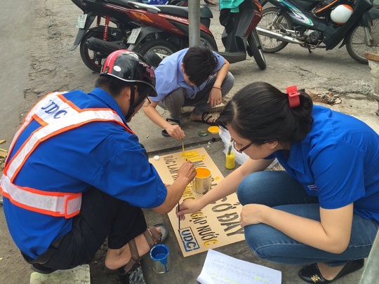 Các bạn đoàn viên lom khom tô, vẽ dòng chữ "Đừng bỏ rác ở đây - rác làm tắc cống gây ngập nước" |