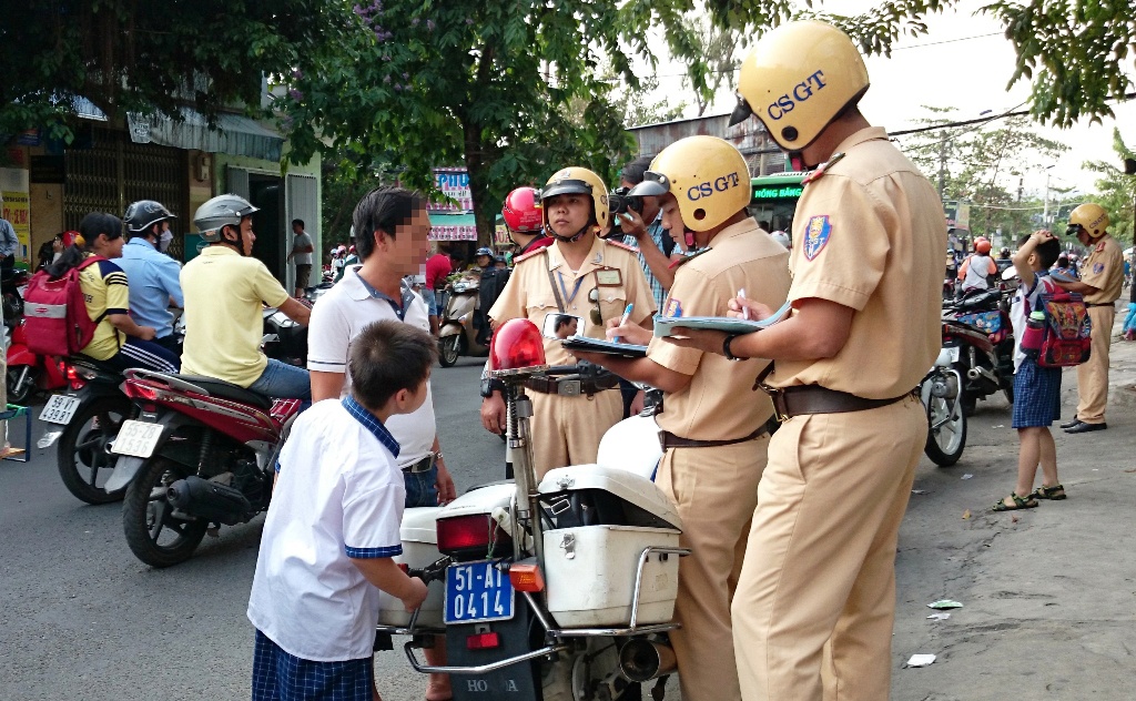 | Chiều 14/4, tại giao lộ Lâm Văn Bền - đường số 37, tổ tuần tra Đội CSGT quận 7 phát hiện nhiều phụ huynh chở học sinh trên 6 tuổi nhưng không đội MBH cho các em. Tuy nhiên, một số người không chịu ký vào biên bản. Các chiến sĩ giải thích, hình ảnh vi phạm đã được camera ghi lại, nếu cần có thể về trụ sở công an xem lại. Điều này khiến tất cả người vi phạm nhanh chóng hợp tác với tổ CSGT. |