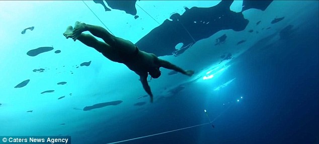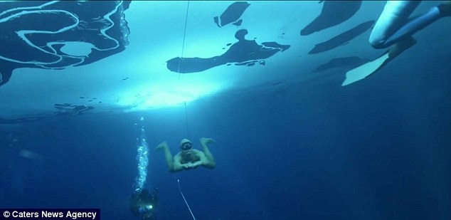 | Dưới làn nước lạnh, trong khi những thợ lặn chuyên nghiệp phải sử dụng đến các thiết bị chuyên dụng như đồ lặn, hệ thống thở máy, chân nhái... thì Severinsen chỉ cần dùng tới kính bơi. |