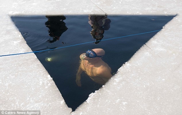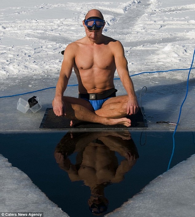 | Sau khi ngồi thiền, Severinse nhảy xuống nước. Cái lạnh của hồ băng dường như không ảnh hưởng gì đến người đàn ông này. |