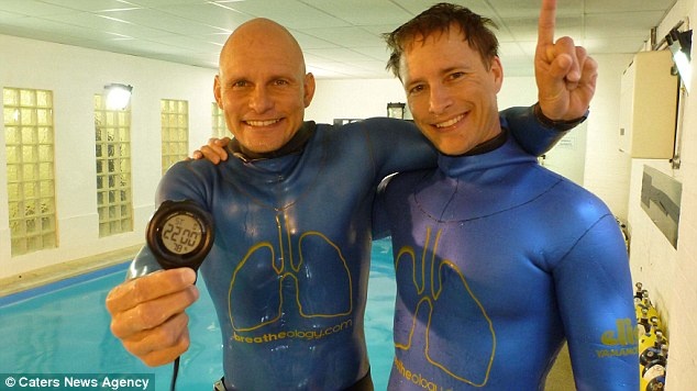 | Tháng 10/2012, Stig Severinsen (trái), biệt danh là "người đàn ông không thở", đã phá kỷ lục thế giới dành cho nội dung nín thở lâu nhất diễn ra tại một hồ bơi ở thủ đô London, Anh. |