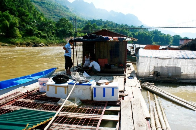 | Khu thuyền bè nuôi cá chiên của ông Nguyên, ông Hà trên sông Gâm đoạn chảy qua Bắc Mê. |