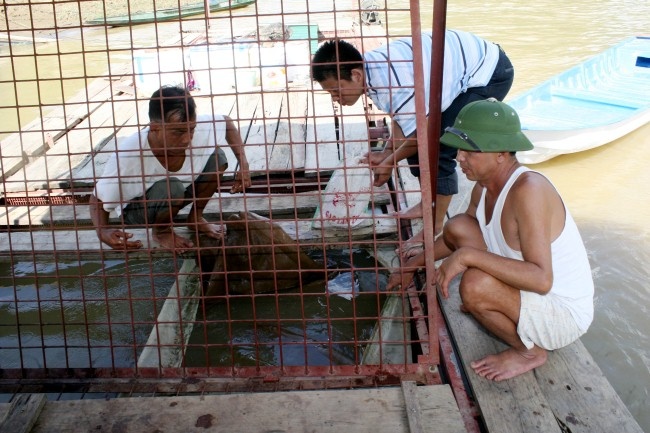 | Ông Nguyên, ông Hà đang chỉnh trang lại lồng nuôi nhốt, nơi thuần phục loài “thủy quái” trên sông Gâm. |
