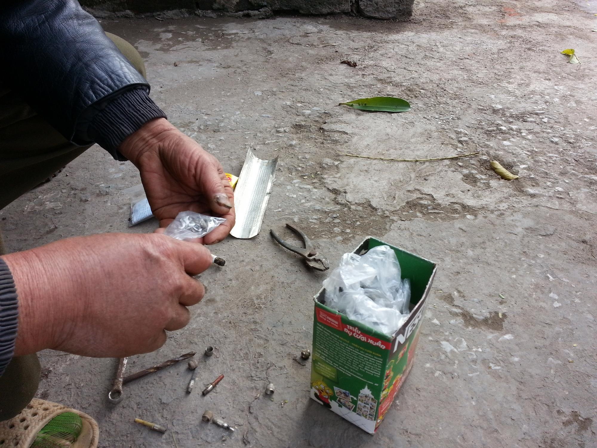 | Đồ nghề rất đơn giản, chỉ vài ba cái bu-lông, cờ-lê, kìm, van xe, giun... được ông gói gọn trong vài cái hộp để sẵn trong nhà. |