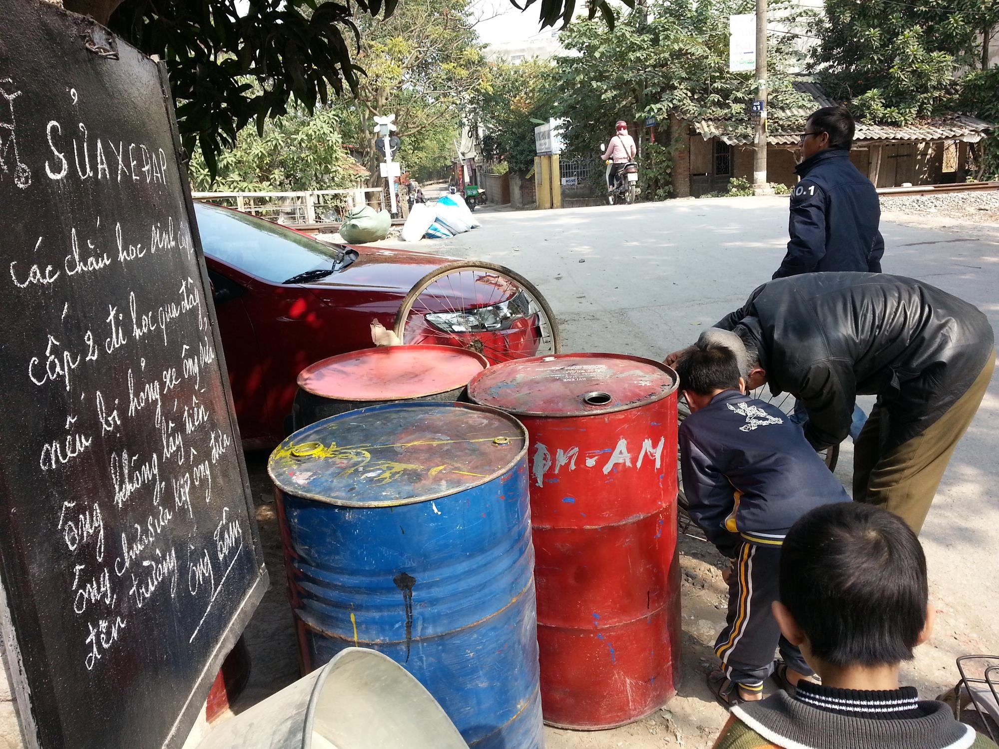 Nơi ông sửa xe chính là phía trước của tấm bảng "sửa xe miễn phí" gây sốt dư luận mấy ngày gần đây.