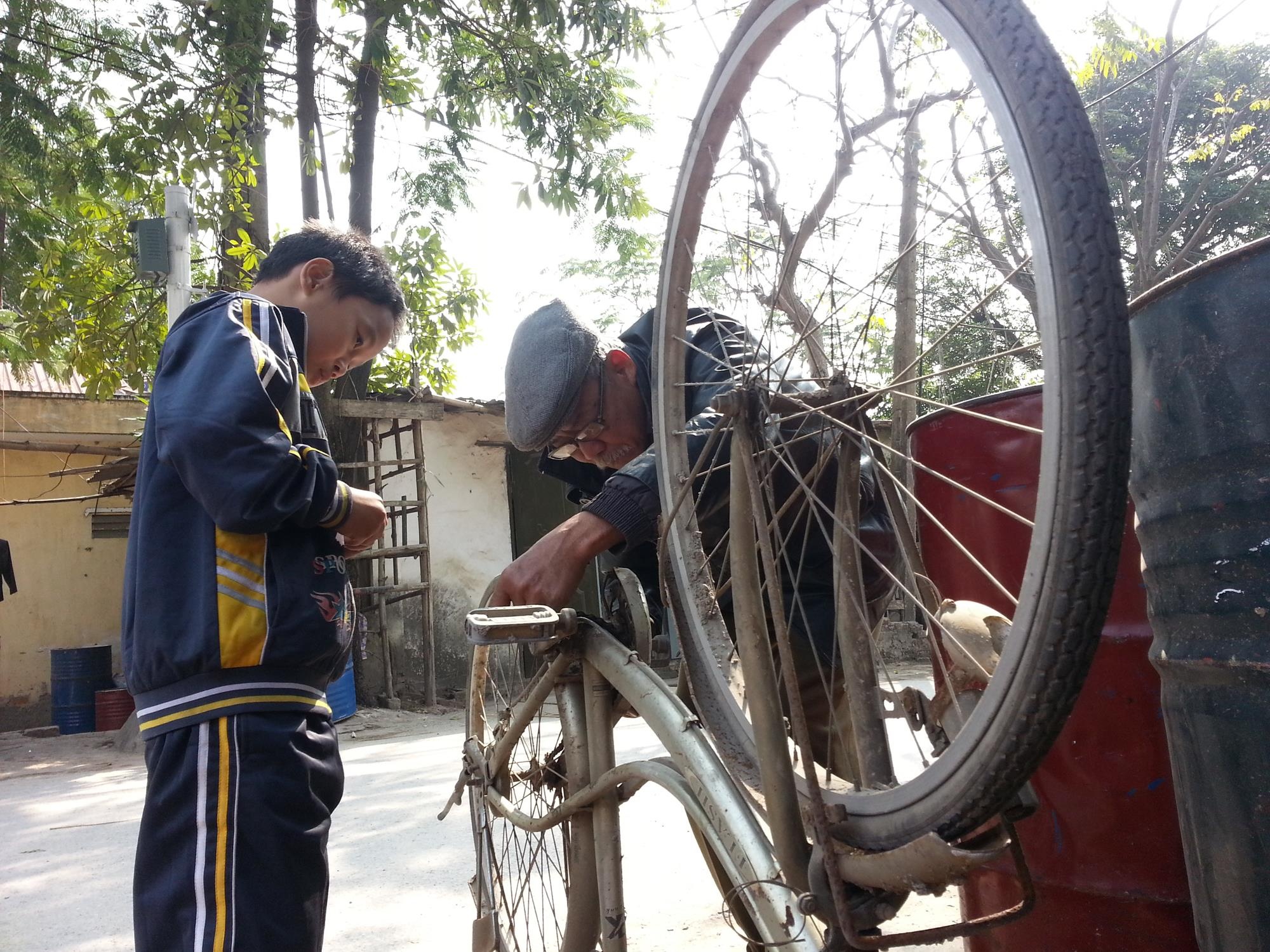 Ông Tâm ngay lập tức đi tìm đồ nghề để sửa xe cho cháu bé.