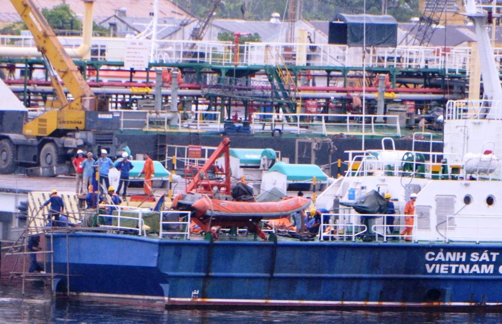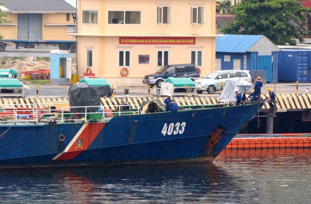 | Cú đâm khiến mạn phải tàu Cảnh sát biển Việt Nam 4033 bị vỡ chiều dài 3 m, rộng 1 m, hư hỏng máy phải và các trang thiết bị khác. Trong ảnh: Công nhân và kĩ sư của tổng công ty Sông Thu kiểm tra sửa chữa nơi bị hư hỏng... |