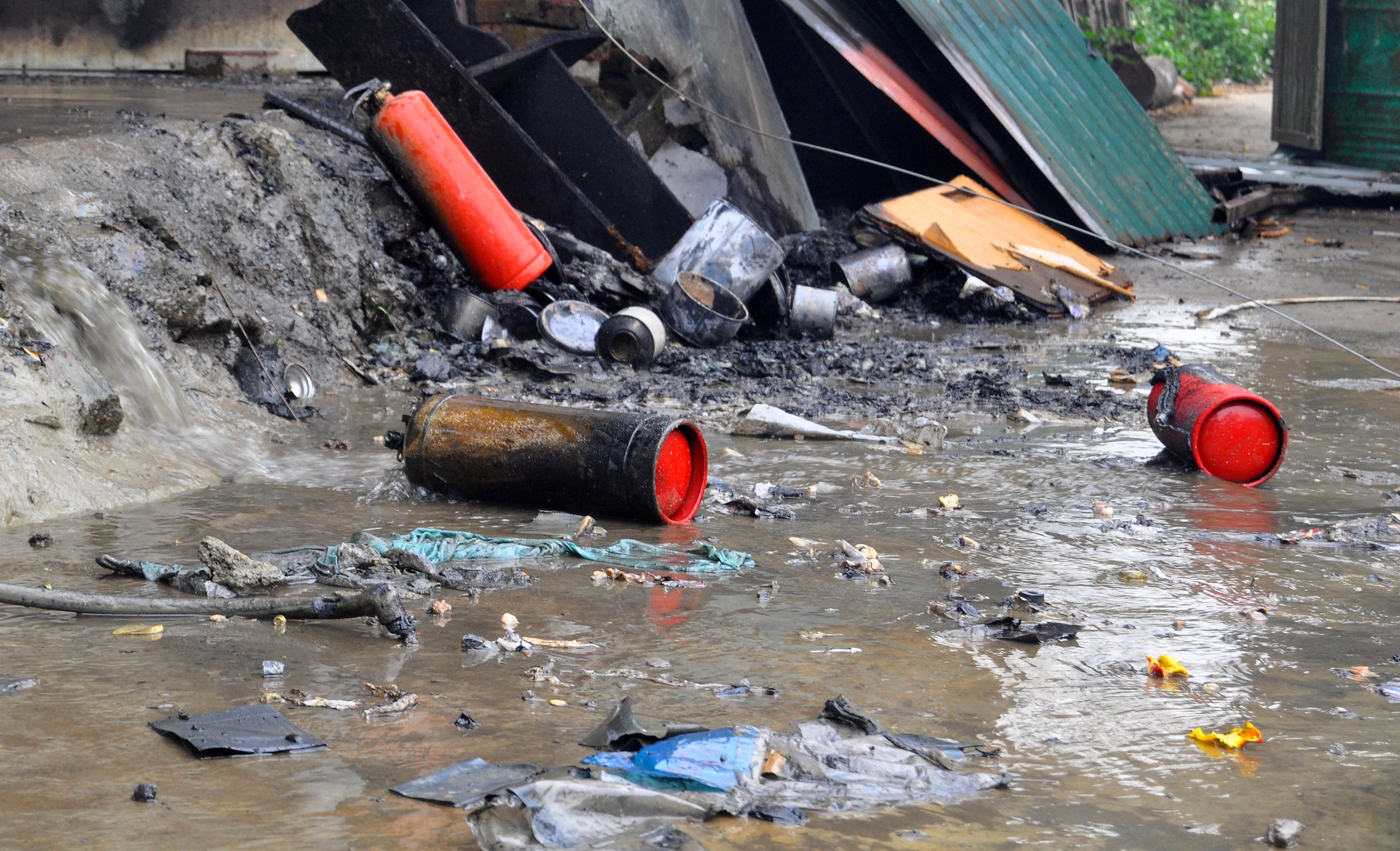| Hơn chục bình cứu hỏa mini nằm chỏng chơ ở hiện trường. |