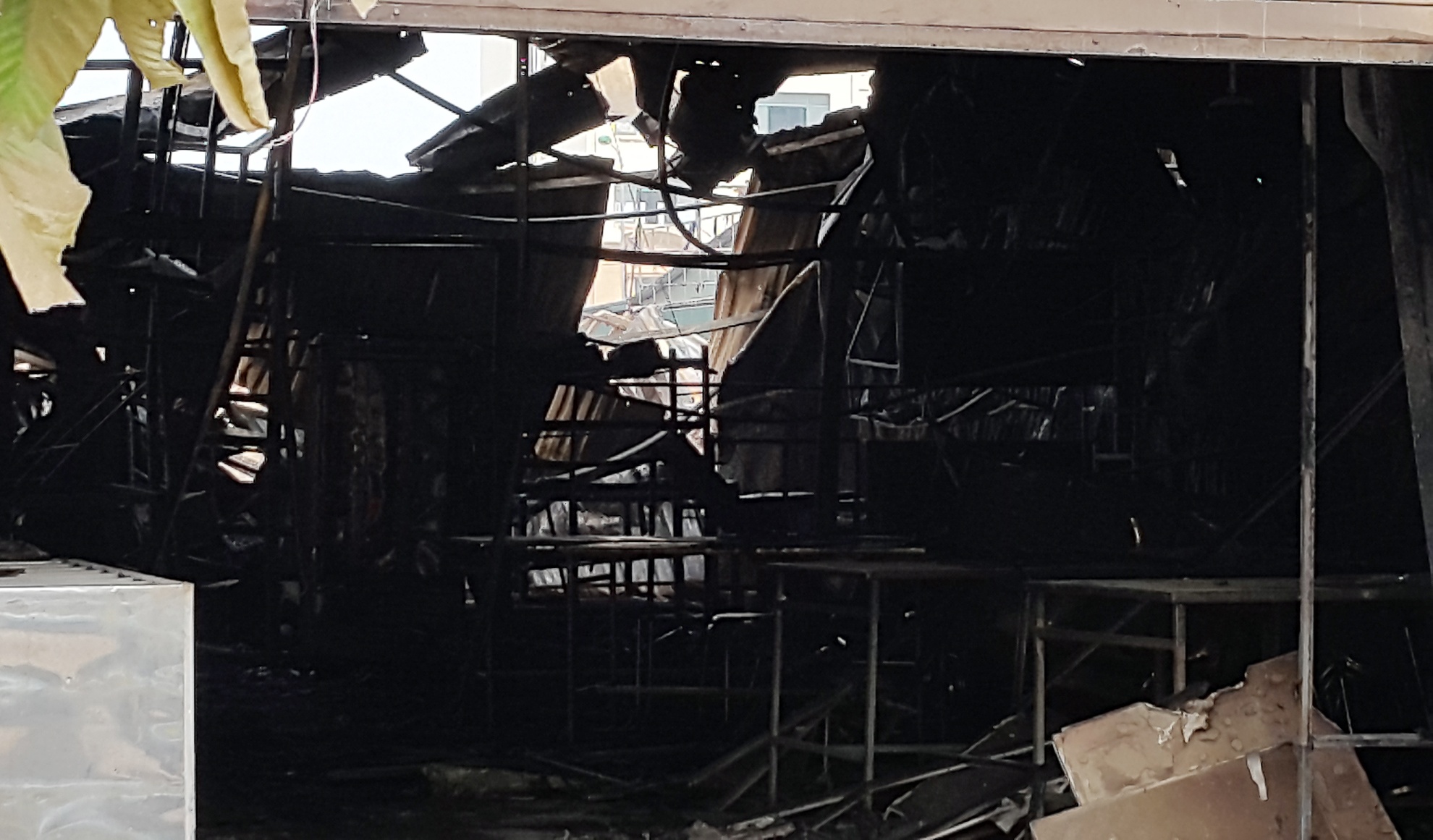 | Bên trong toàn bộ mái tôn đã sập xuống, đồ đạc chỉ còn là đống sắt đen xì và tro tàn. |