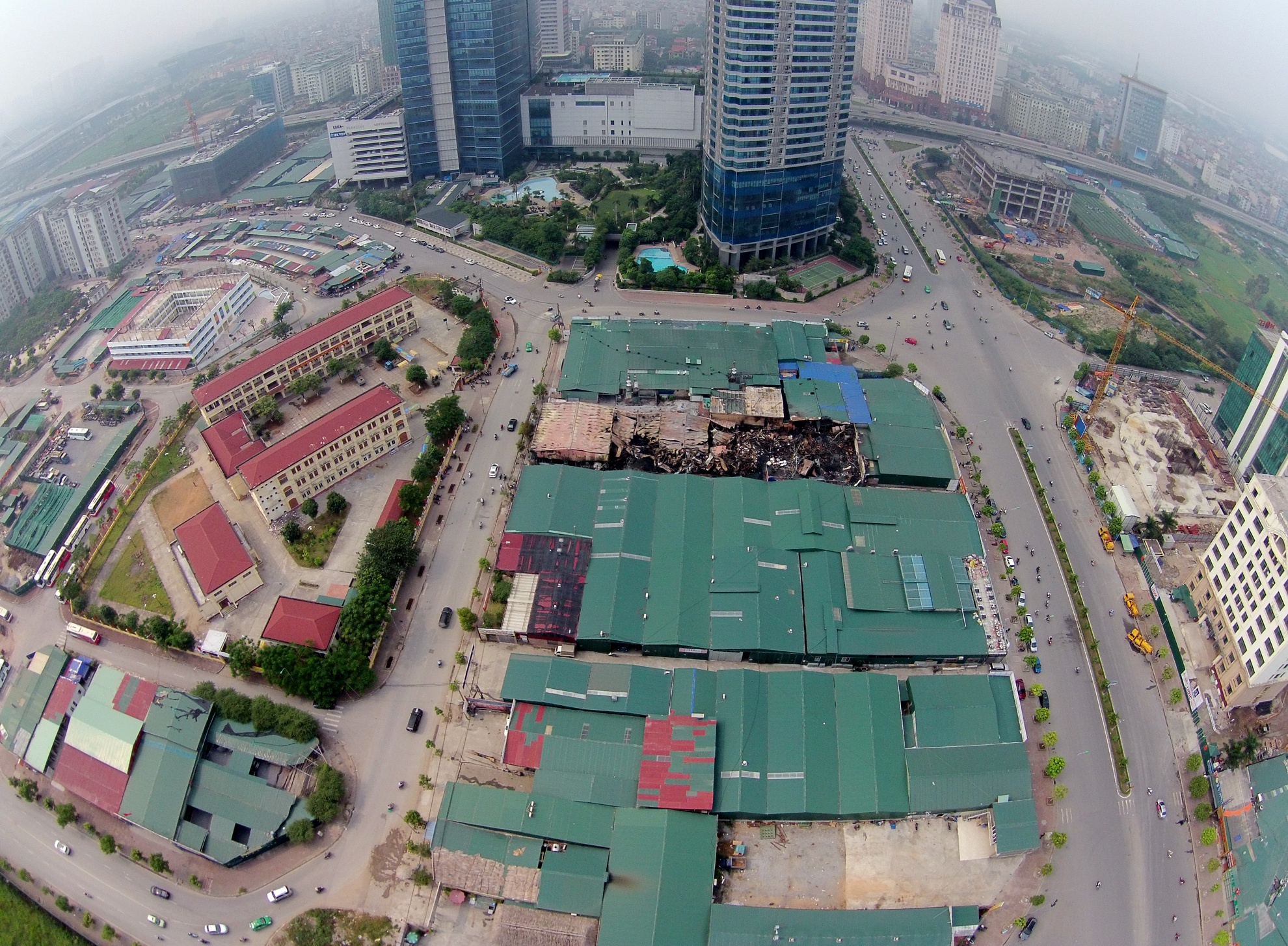 | Quang cảnh khu vực xảy ra hỏa hoạn đêm 18/10, gần đó là bãi đỗ ô tô khách và trường tiểu học Nam Trung Yên (Hà Nội). |