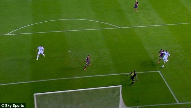 | Bale nhận bóng từ Fabio Coentrao ở vị trí cách khung thành Barca khoảng 59 m. Sau đó, Marc Bartra cố gắng đẩy Bale ra ngoài sân. Tuy nhiên, Bale dùng tốc độ vượt qua Bartra và thực hiện pha dứt diểm đánh bại thủ môn Pinto. Ảnh: Daily Mail. |