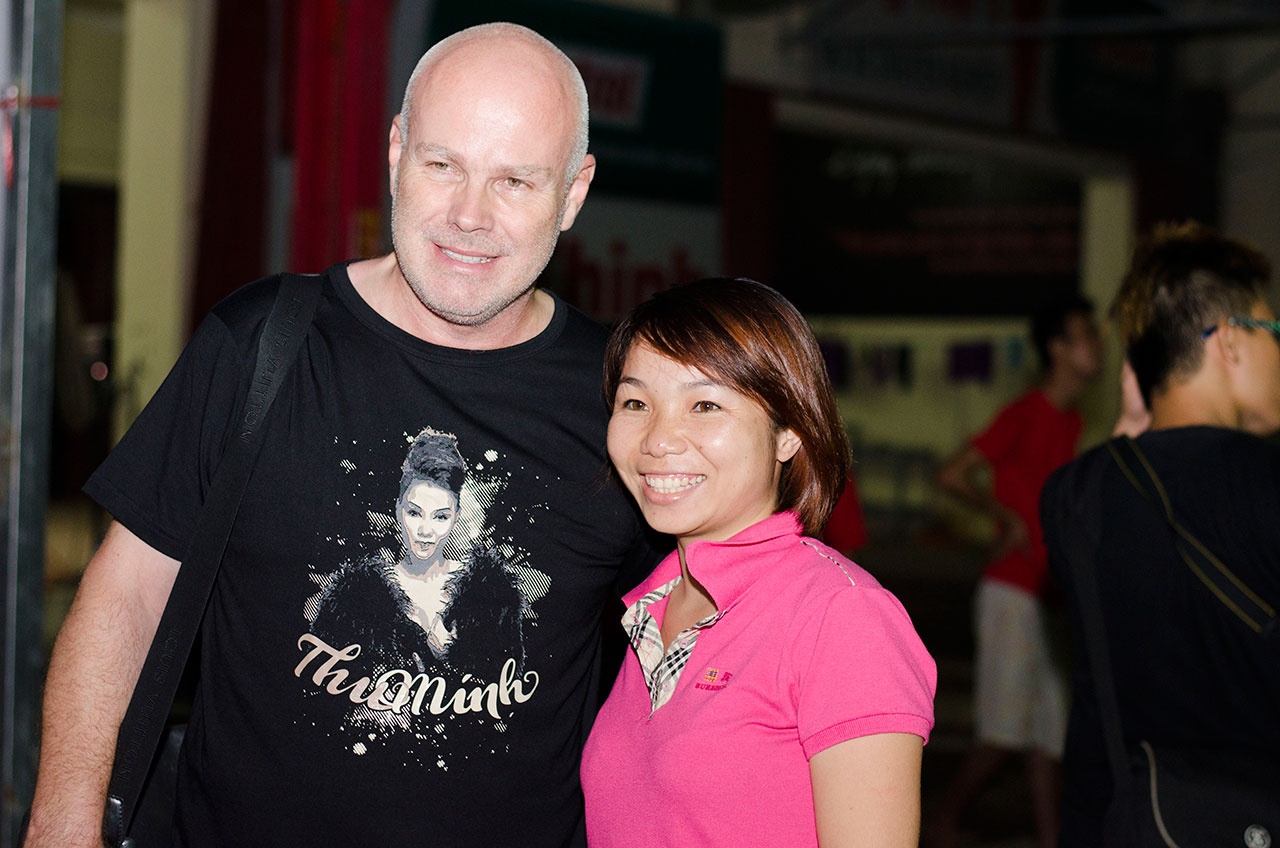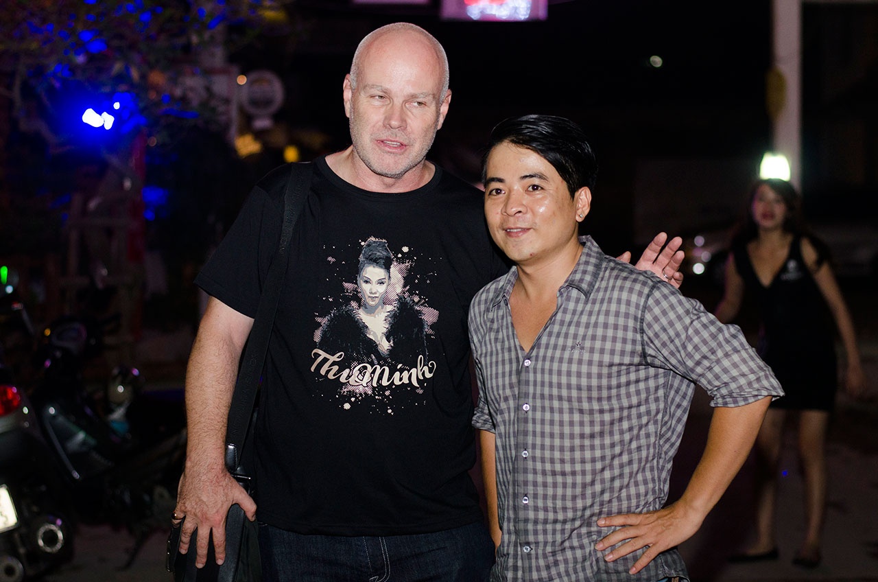 ... Anh mặc áo in hình và tên bà xã khi tới dự sự kiện này. Chồng Tây của Thu Minh vui vẻ trò chuyện cùng bạn bè và các fan của vợ trong khi nữ ca sĩ bận rộn trả lời phỏng vấn.