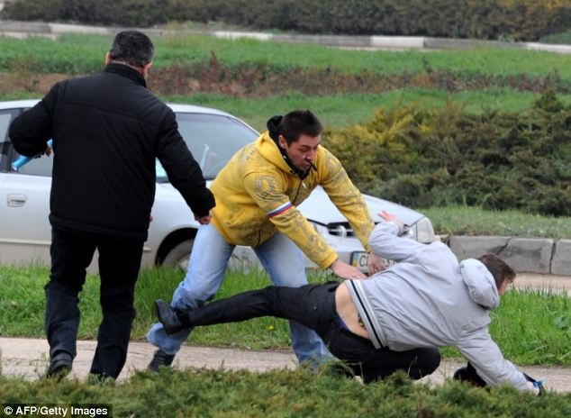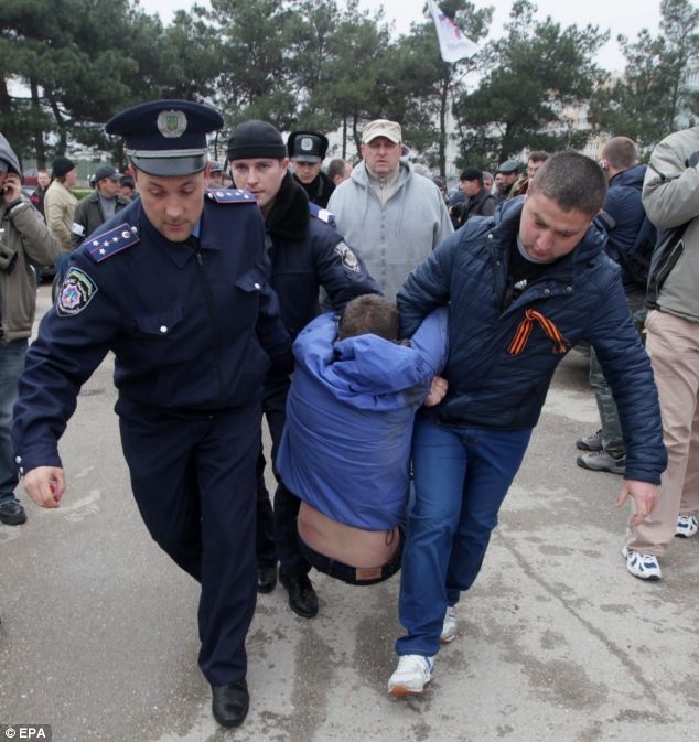 | Cảnh sát bắt một người đàn ông sau cuộc đụng độ giữa những người ủng hộ Nga và người ủng hộ Ukraina tại thành phố cảng Sevastopol, Crimea hôm 8/3. Ảnh: EPA. |