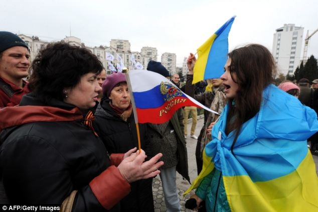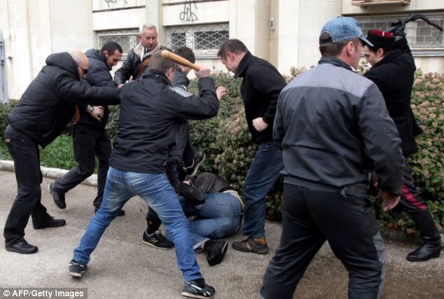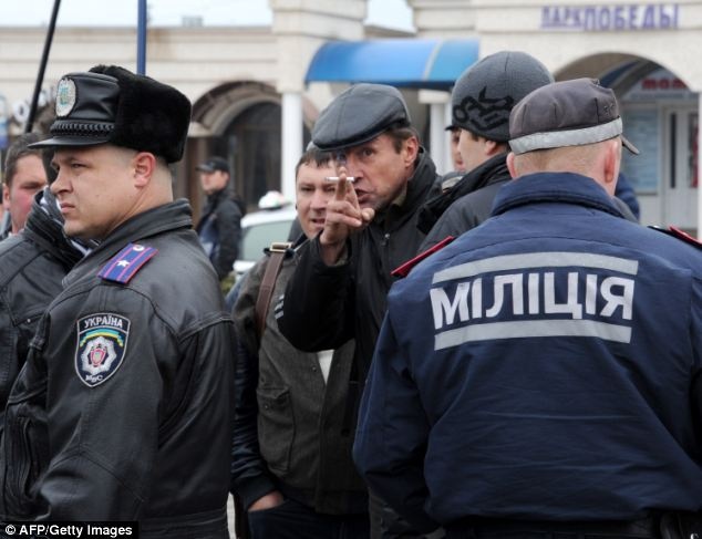| Một người ủng hộ Nga chỉ tay về phía đám đông ủng hộ Ukraina ở thành phố Sevastopol. Khoảng 100 người Cossack (Cô dắc) và những dân quân ủng hộ Nga đụng độ những người ủng hộ chính phủ Ukraina. Ảnh: AP. |