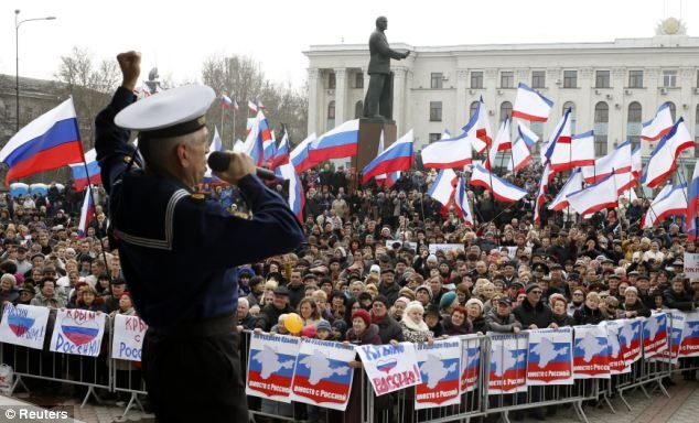 | Tại thành phố Simferopol, thủ đô của Crimea, hơn 4.000 người tập trung để tán thành việc sáp nhập khu tự trị vào Nga. Ảnh: Reuters. |