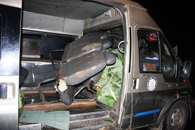 | Chiếc xe khách bị nát toàn bộ phần đầu. |
