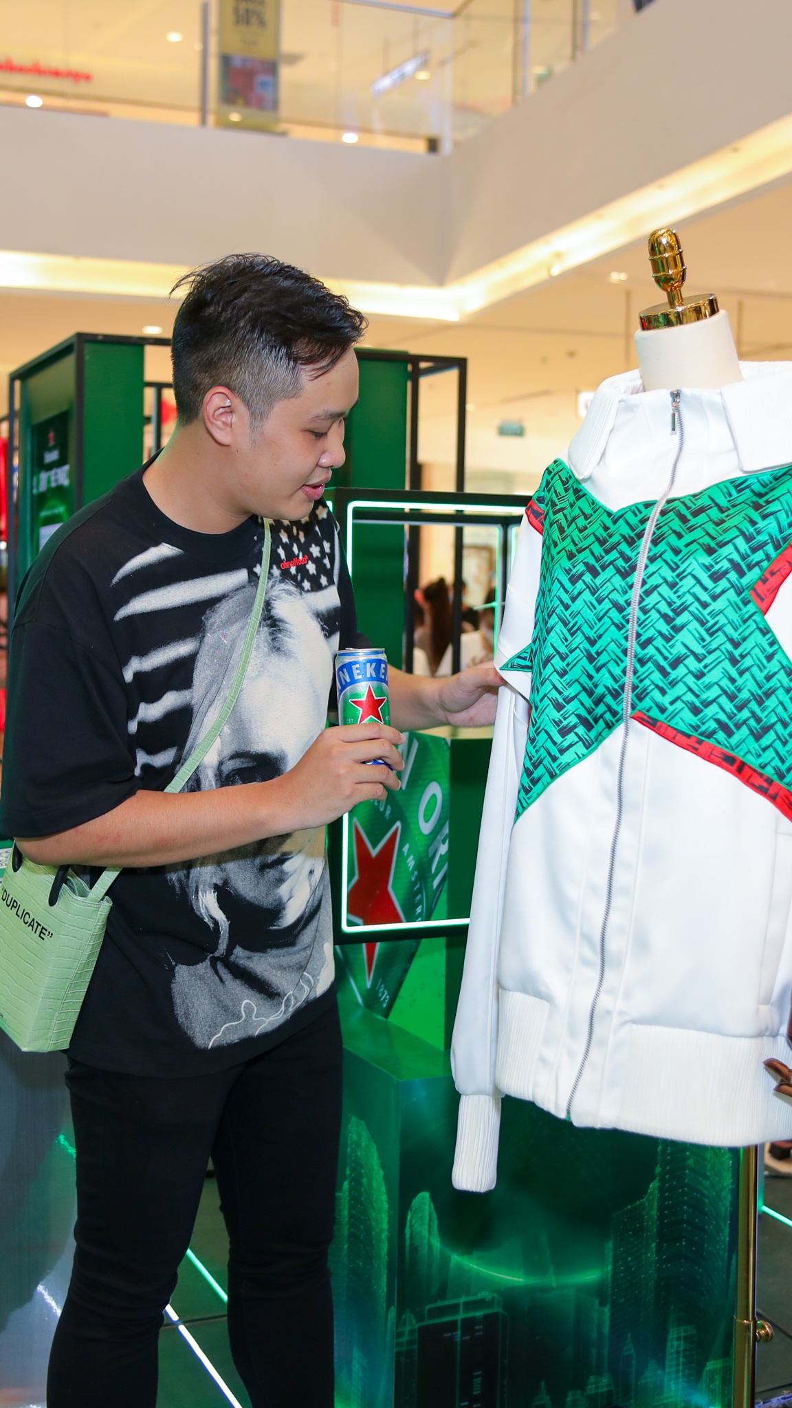 | Vật phẩm trưng bày ở sân khấu chính sự kiện cũng khiến tôi không thể rời mắt. Đơn cử là áo bomber phiên bản giới hạn (2 chiếc) với điểm nhấn là hình ảnh ngôi sao đặc trưng của thương hiệu bia lừng danh. Thiết kế lấy cảm hứng từ BST “Em hoa” của NTK Công Trí là quà tặng cho hai người may mắn nhất tham gia chương trình. Tôi thật sự mong được sở hữu chiếc áo đặc biệt này. |