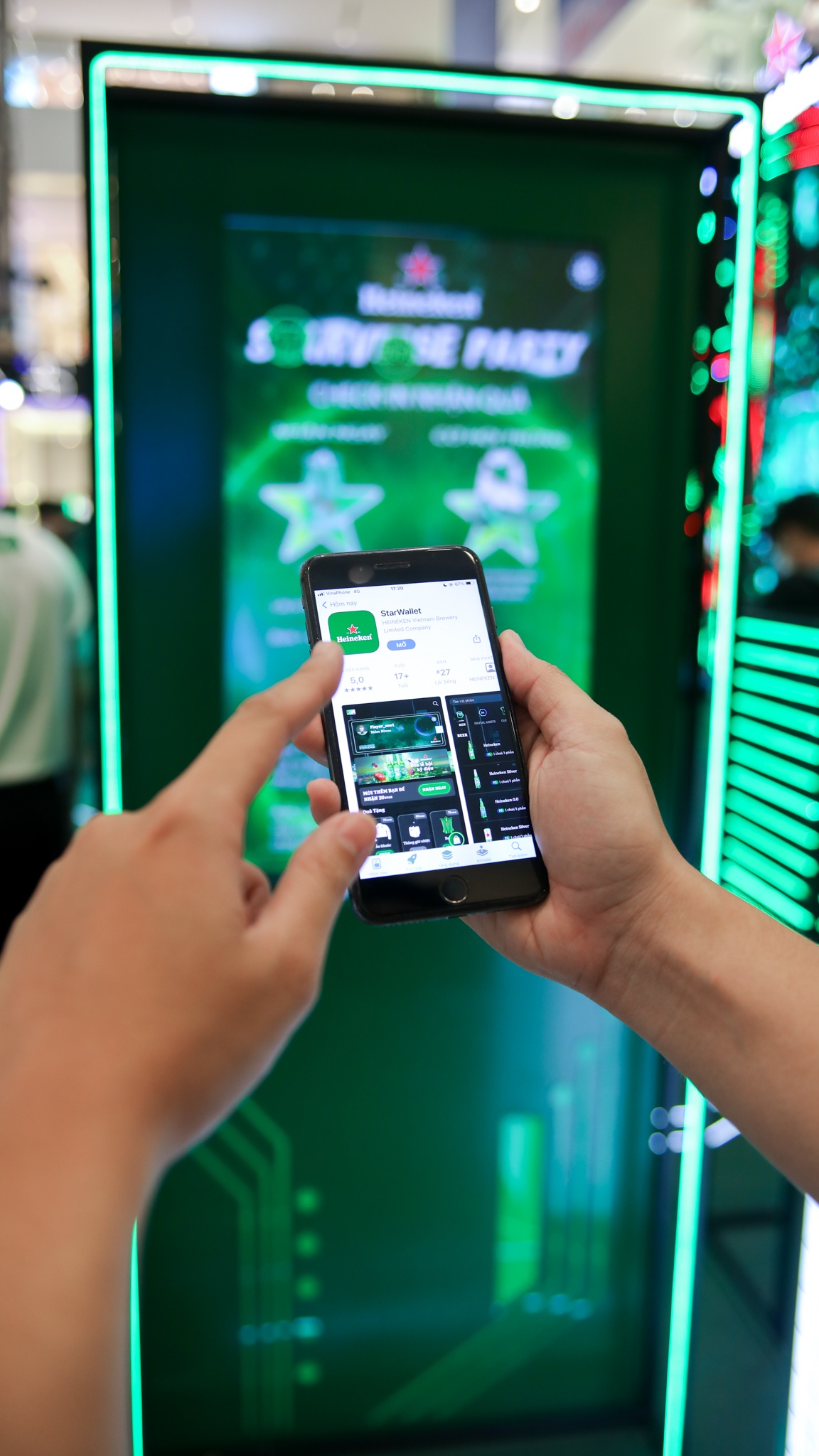 | Tranh thủ dạo quanh khu vực chơi game Starverse trên smartphone, tôi nhanh tay hoàn thành thử thách và tích được kha khá điểm. Những toà nhà mô phỏng chai bia với màu xanh nổi bật, ngôi sao đỏ, hay billboard “Men A thượng hạng”, “Lúa mạch thuần chất”,… khiến người chơi đắm chìm vào thế giới của những bậc thầy ủ bia. |