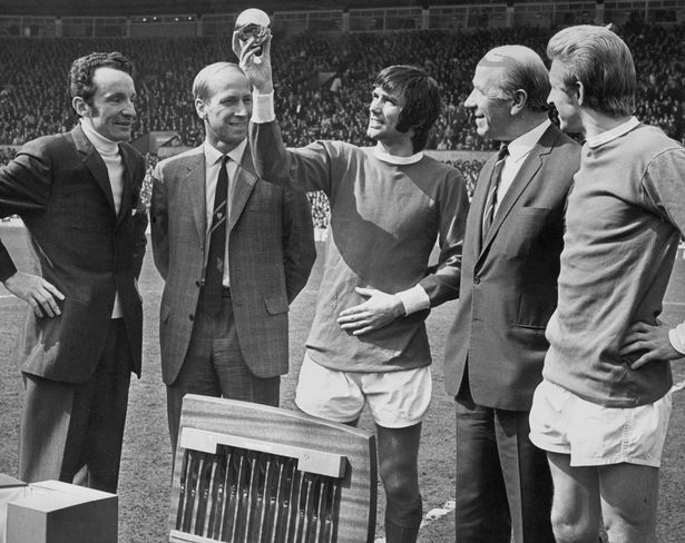 | 29/5/1968: Best và đàn anh Bobby Charlton ăn mừng chức vô địch C1 sau chiến thắng 4-1 trước Benfica trong trận chung kết tại Wembley. |