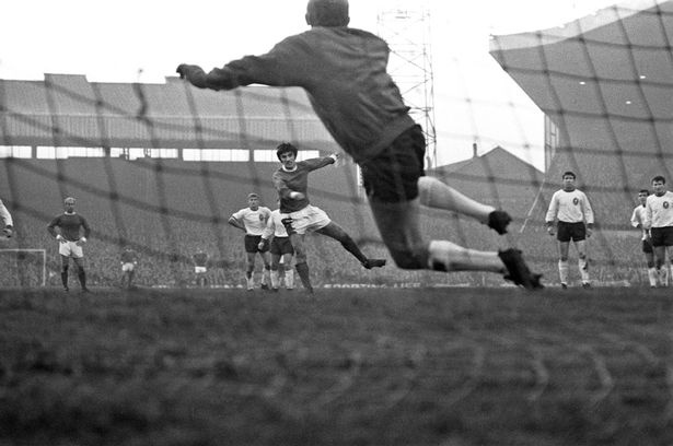 | 10/121966: Best hạ gục thủ thành Tommy Lawrence của Liverpool trên chấm phạt đền. |