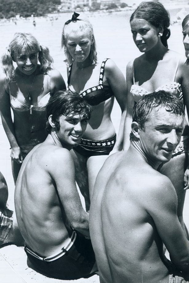 | 5/9/1967: Chân sút lừng danh khoác áo "Quỷ đỏ" và bạn thân Mike Summerbee thu hút sự chú ý của người hâm mộ tại bãi biển Majorca (Tây Ban Nha). |
