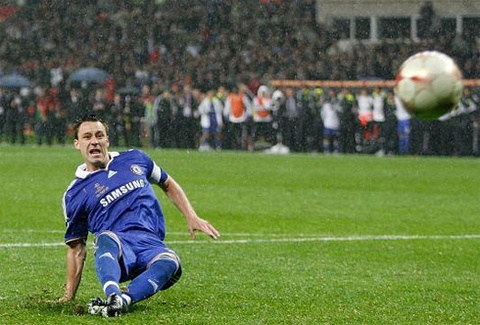 | Cú ngã của John Terry trên chấm phạt đền trong trận chung kết Champions League 2008. Ảnh: Getty Images. |