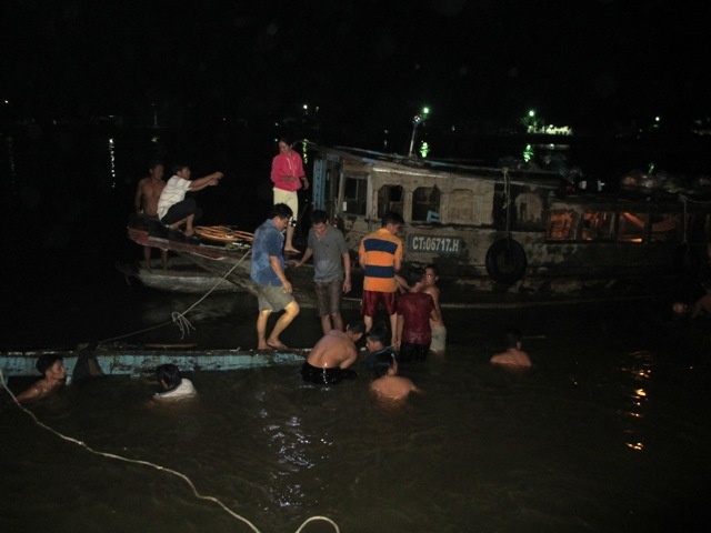 | Đến 23h, công tác trục vớt tài sản chiếc ghe bị nổ mang số hiệu 49K-CT00439H, chạy tuyến Vĩnh Thuận (Rạch Giá) - Cần Thơ vẫn đang diễn ra. |