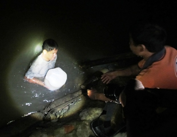 | Hàng chục người dân được huy động, trục vớt tài sản. Hàng hóa nổi trên sông được trục vớt. |