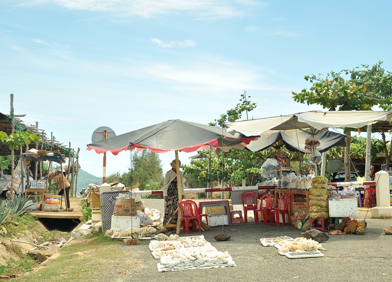 Tôi hỏi chuyện bé Ly, 10 tuổi, nhà gần đây, tranh thủ thời gian nghỉ hè ra “mở cửa hàng” bán vài sản vật của biển cả như: vài con ốc biển, sao biển, những chùm san hô, những hòn đá có hình thù đẹp… Cô bé lanh lợi kể cho chúng tôi về việc con đường cái được rộng mở khiến du khách đến đây nhiều hơn.