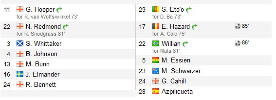 Sự điều chỉnh đội hình của HLV Mourinho khi đưa Hazard vào thay Ashley Cole không thể thi đấu do bị đau đã giúp Chelsea tăng cường khả năng tấn công. Sau khi bỏ lỡ cơ hội ghi bàn ở phút 78, Hazard giúp đội khách nâng tỷ số lên 2-1 ở phút 85. Ngay sau đó, Willian ghi bàn ấn định chiến thắng 3-1 cho Chelsea.