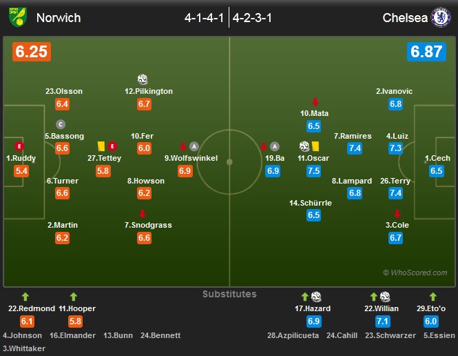 Bàn thắng sớm của Oscar có tác động rất lớn đến tâm lý thi đấu của Chelsea. Việc đội khách chiếm thế chủ động trên sân không gây bất ngờ cho khán giả có mặt ở Carrow Road. Từ phút 14 đến 19, Demba Ba có hai cơ hội ghi bàn, nhưng tiền đạo khoác áo số 19 của Chelsea đều không thể đánh bại được thủ môn Ruddy bên phía Norwich.