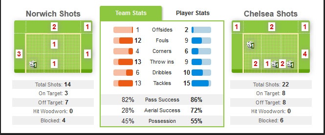 | Chelsea đánh bại Norwich với tỷ số 3-1. |