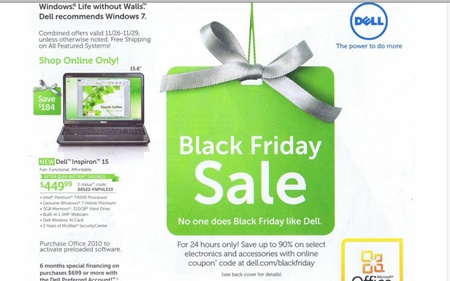 Poster đầu tiên là của Dell nhân dịp Black Friday năm 2010, quảng cáo một cỗ Dell Inspiron 15 với giá 450 USD. Đây được coi là khuyến mại "khủng", một năm chỉ có một dịp mà Dell áp dụng để lôi kéo người dùng mua sắm trên trang Dell.com.