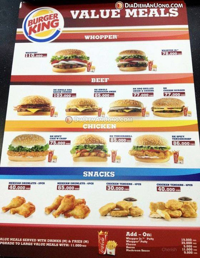 | Giá của Burger King tại Việt Nam. |