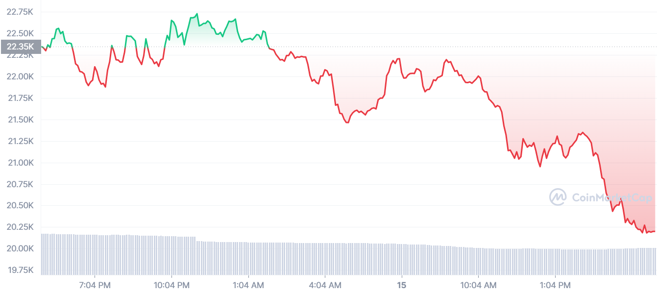 Giá Bitcoin bước vào đà giảm mạnh từ ngày 12/6. Trong vòng 24 giờ qua, giá có lúc phục hồi nhẹ lên gần 23.000 USD/đồng, rồi nhanh chóng rơi xuống dưới ngưỡng 21.000 USD/đồng.