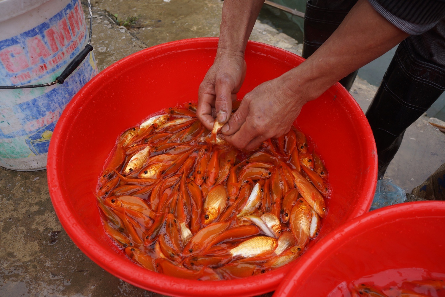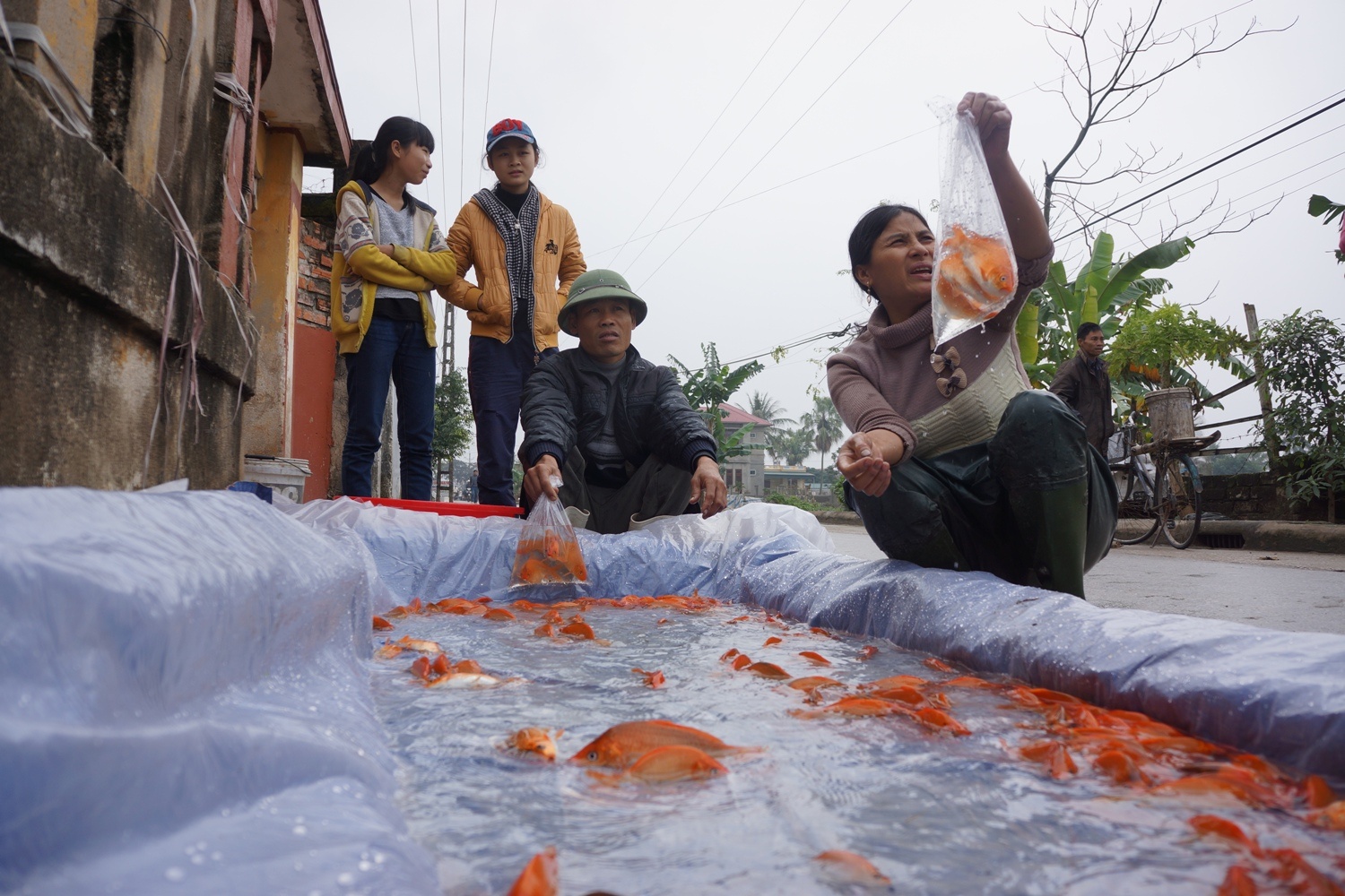 | Cá chép được người bán phân thành 3 loại to, trung bình và nhỏ để bán. Cá chép làng Tân Cổ được các thương lái ưa chuộng vì có màu đỏ óng, to đều, không có đốm đen.
